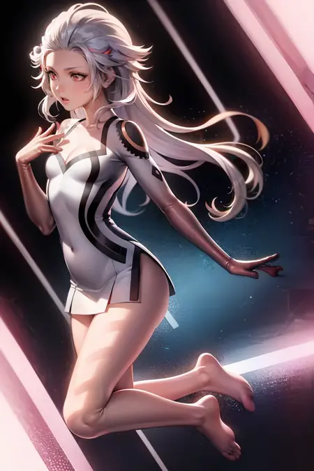 她的默认装扮是 aiba, 赤脚, 小胸, 连衣裙, 胸部轮廓, 发光