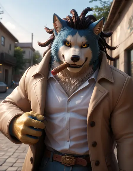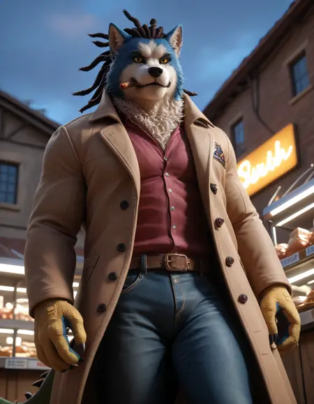 // Illustrious: ch0juro_kon_ch1mera, chimera, male focus, furry male, 1boy, furry, muscular, solo, tail, animal ears, dreadlocks, pants, shirt, coat, belt, jeans, short hair, blue shirt, thick eyebrows, black sclera, colored sclera, yellow eyes