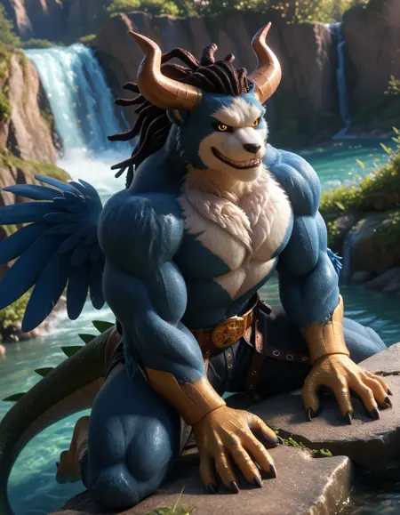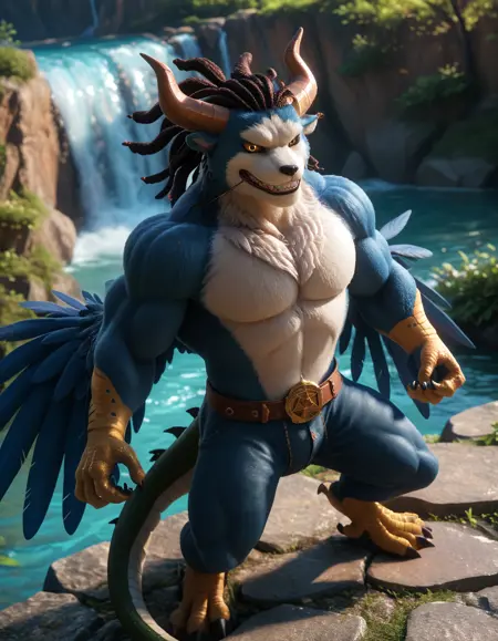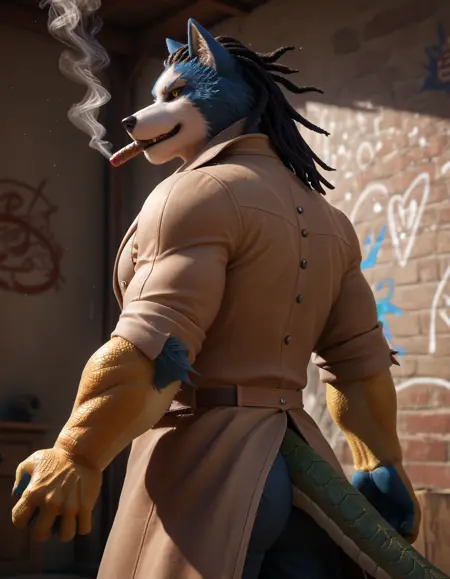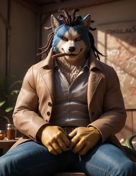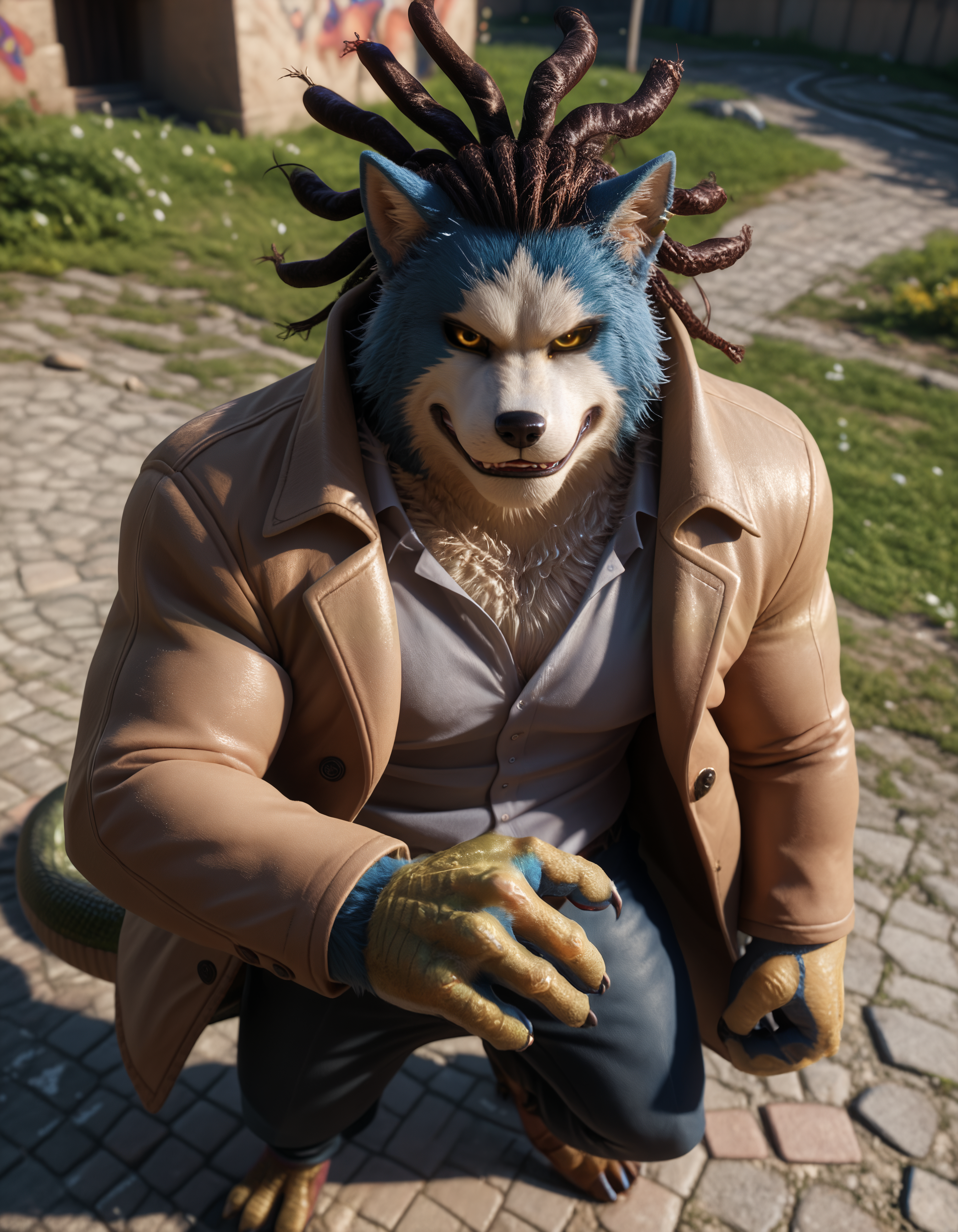 // Pony: chojuro_kon_chimera, dreadlocks, anthro, canid, canis, canine, male, mammal, furry male, clothing, male focus, furry, wolf, bara, animal ears, fur, scar, black sclera, colored sclera, coat, yellow eyes, wolf ears, blue fur, scaly hands, green lizard tail