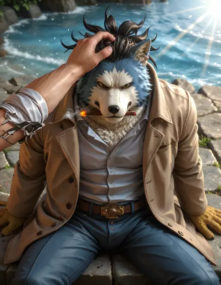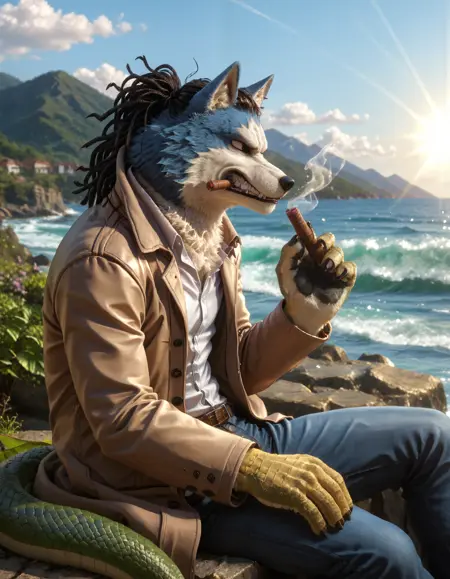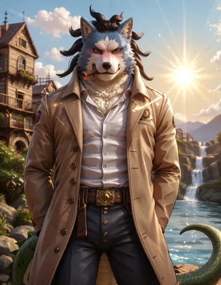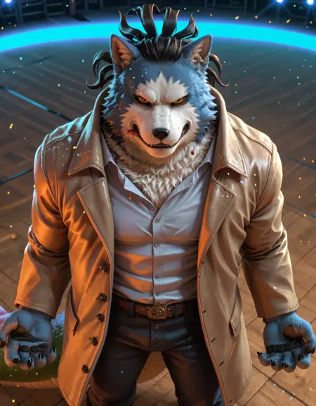 // Pony: chojuro_kon_chimera, dreadlocks, anthro, canid, canis, canine, male, mammal, furry male, clothing, male focus, furry, wolf, bara, animal ears, fur, scar, black sclera, colored sclera, coat, yellow eyes, wolf ears, blue fur, scaly hands, green lizard tail
