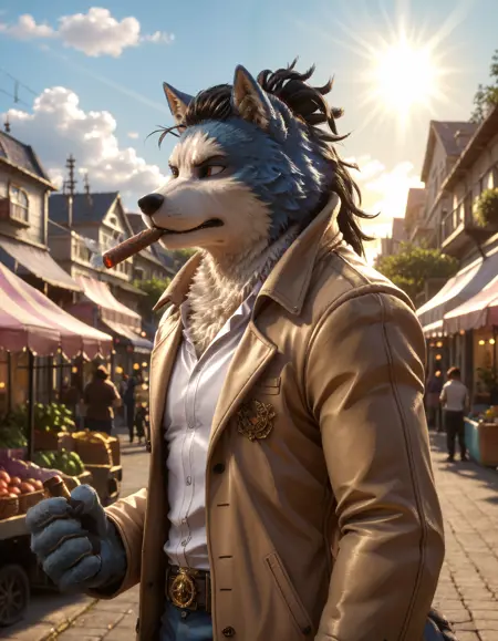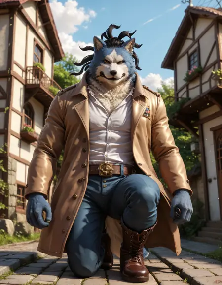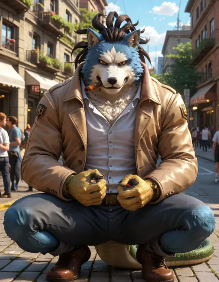 // Illustrious: ch0juro_kon_ch1mera, chimera, male focus, furry male, 1boy, furry, muscular, solo, tail, animal ears, dreadlocks, pants, shirt, coat, belt, jeans, short hair, blue shirt, thick eyebrows, black sclera, colored sclera, yellow eyes