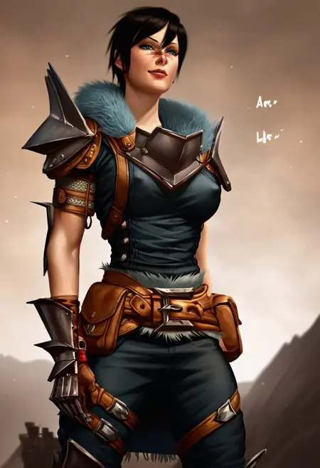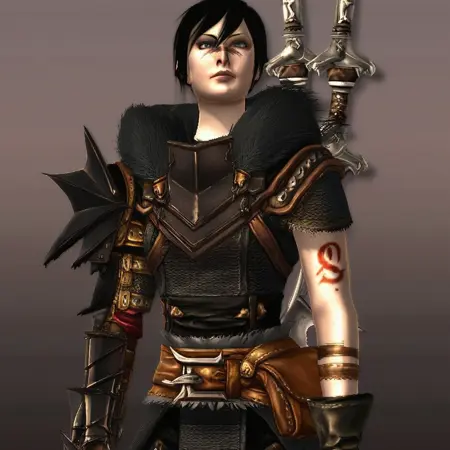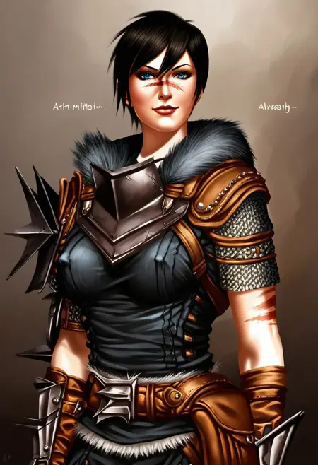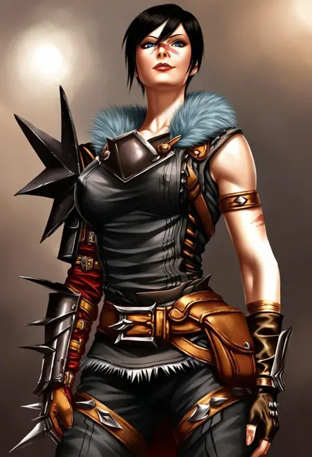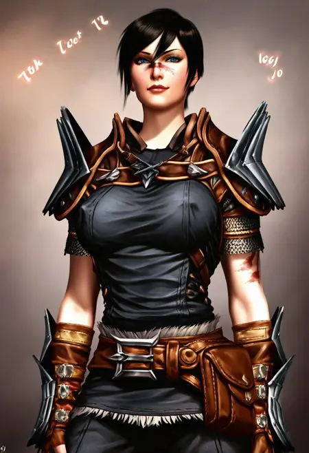 MarianHawke,1girl,单独,黑发,短发,蓝眼,盔甲,肩甲,护肩,手套,护手,嘴唇,腰带,毛皮镶边,背后武器,眉间头发,靴子,及膝靴,锁子甲,胸甲,武器,骨盆帘,疤痕,纹身,