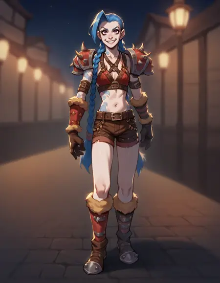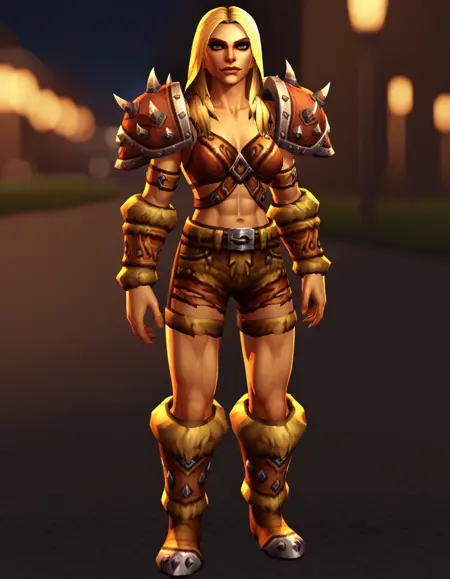 armor, spiked pauldrons, chest harness, shorts, belt, vambraces, boots, fur trim