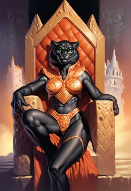 태그는 "pantera, 털이 있는 여자, 검은 털, 금색 갑옷, 금색 벨트, 검은색 및 금색 부츠, 녹색 눈"이며, 무기로는 옵션으로 "금색 검"을 포함할 수 있다. 수정: 그녀가 갑옷을 착용할 때 포즈 지시를 상당히 강하게 해야 한다.