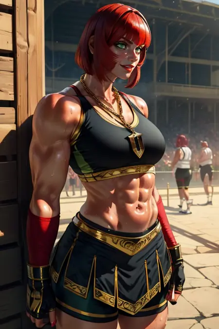 Boxing fingerless gloves, black sports bra with gold trim, gold necklace, bike shorts, black small skirt with gold trim, toeless legwear,
