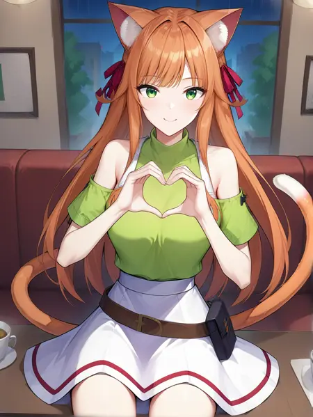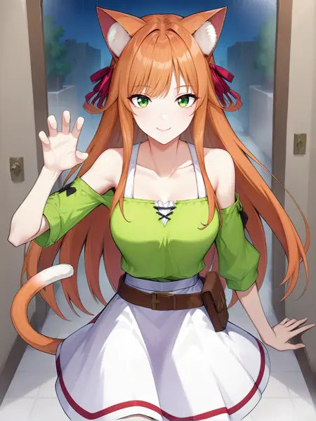 外見: オレンジ色の髪、長い髪、動物の耳、動物の耳のふわふわ、緑の目、赤い髪リボン、猫の尾、ツートンの尾