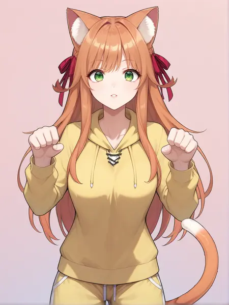 外观:橙色头发,长发,动物耳朵,动物耳绒毛,绿色眼睛,红色发带,猫尾,双色尾巴