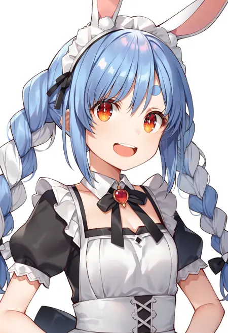 usada pekora, virtual youtuber, animal ears, rabbit ears, long hair, multicolored hair, blue hair, braid, twin braids, hair ornament, food-themed hair ornament, carrot hair ornament, breasts, animal ear fluff, fur trim, gloves, black gloves, pantyhose,