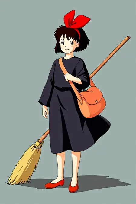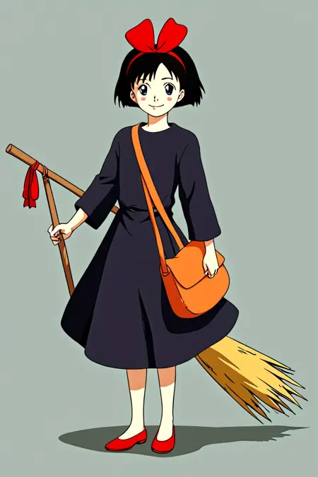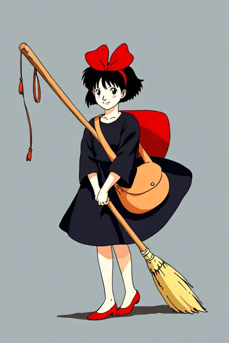 kiki, 1girl, solo, smile, short hair, black hair, dress, bow, hair bow, hairband, shoes, bag, black dress, broom, witch, flats, kiki (majo no takkyuubin), studio ghibli (style), retro style, 80s (style),