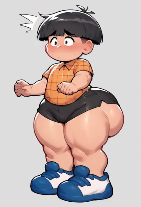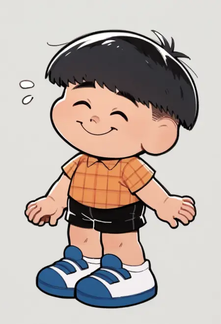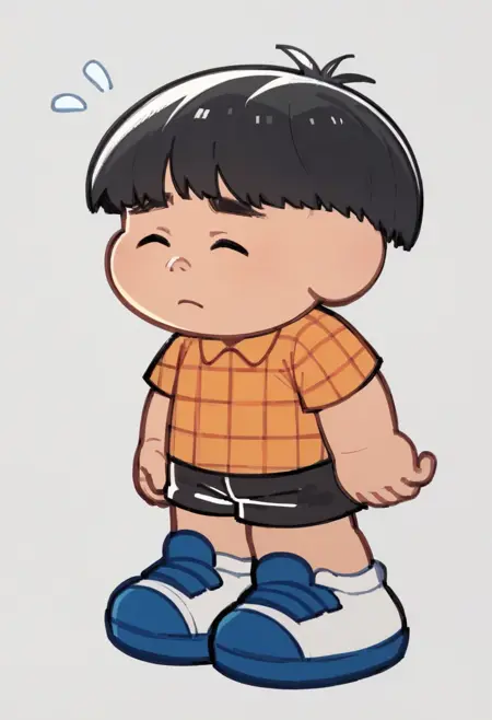 NimbusTDM, 1boy, slanted eyes, closed eyes, bowl cut, black hair, plaid orange shirt, black shorts, blue and white sneakers, short