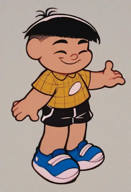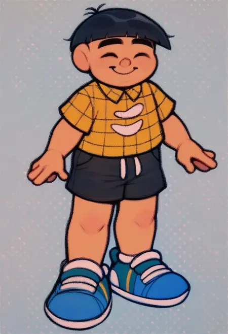 nimbus, shirt, black hair, 1boy, closed eyes, shorts, shoes, black shorts, sneakers, blue footwear, yellow shirt, bowl cut