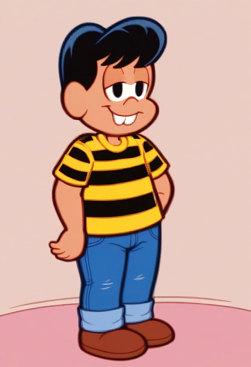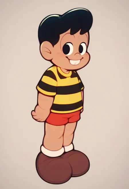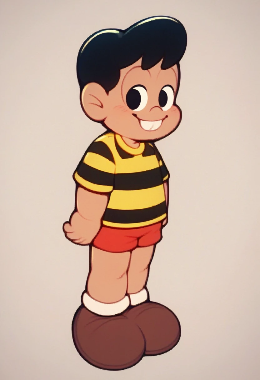 titi, short hair, shirt, black hair, 1boy, shorts, striped clothes, black eyes, striped shirt, yellow shirt, buck teeth