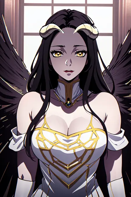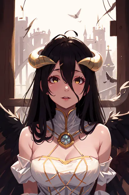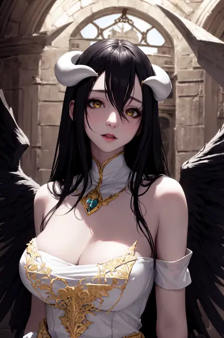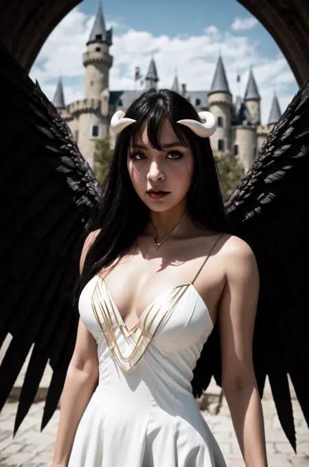 v1.2 사용 시: "검은 날개, 골드 장식이 있는 하얀 드레스, 하얀 뿔, 검은 머리, (낮은 날개,:1.1)"