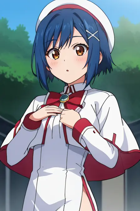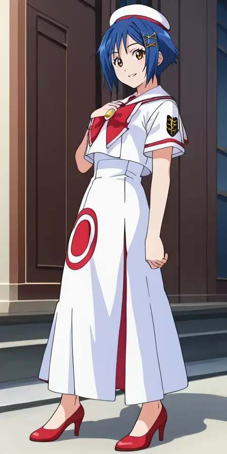 aria company uniform, white beret, blouse, red bowtie, brooch, white sailor collar, short sleeves, long dress, dress, side slit, print dress, red high heels