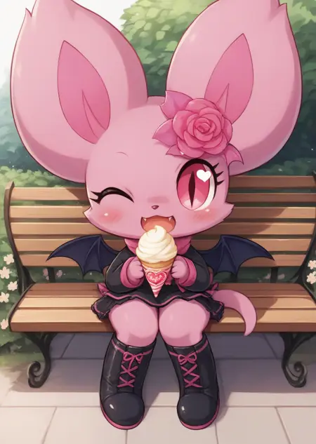 prompts: devi, boots, tail, capelet, mouse tail, pink fur, chibi, furry,