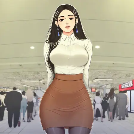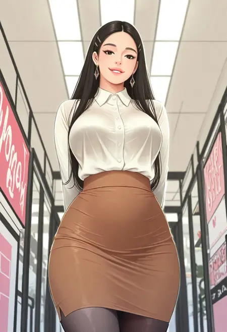 20. ((正式,白色高领长袖衬衫,长棕色铅笔裙,黑色丝袜,长水晶耳环,水晶发夹,))