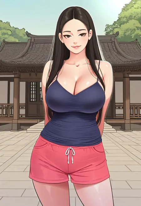 4. ((性感黑色吊带,露骨胸脯,巨大胸脯,深绿色短裤,))