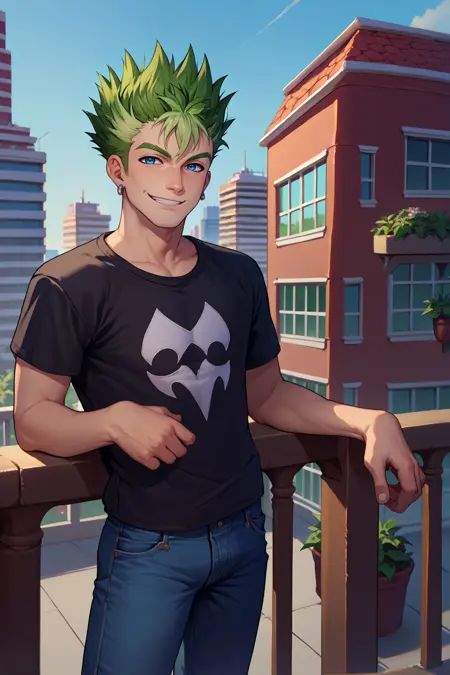 触发词为 "trailsKevin",且必须包含 "尖刺发型、绿色头发、双色头发、蓝色眼睛"。
