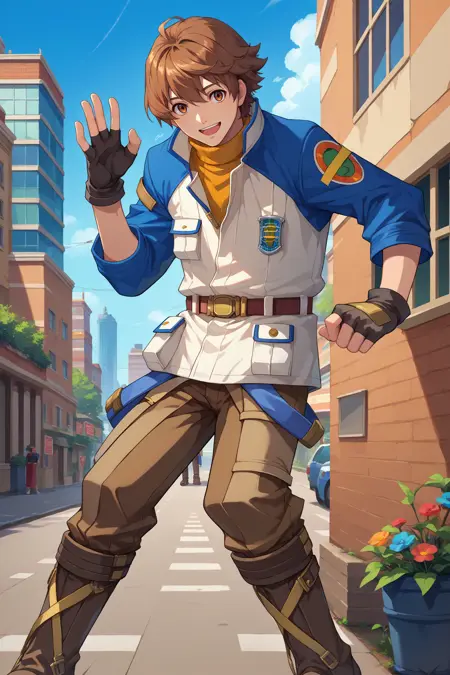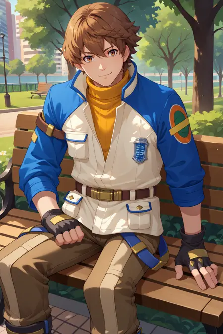 그의 전형적인 외모를 위해 "자켓, 파란색 소매, 터틀넥, 손가락 없음 장갑, 검은 장갑, 벨트, 갈색 바지"를 추가하세요.