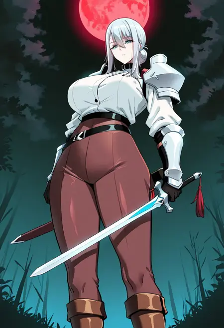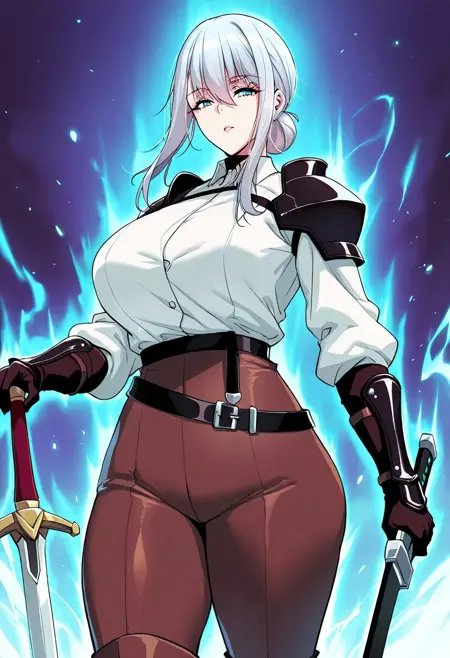 1a. ((medium-sleeves white uniform shirt with black collar, long gloves, midriff, long-stemmed brown pants with black belt, brown boots, shoulder armor, forearm armor, )) + hair bun, + sword