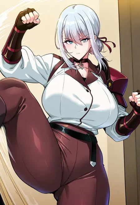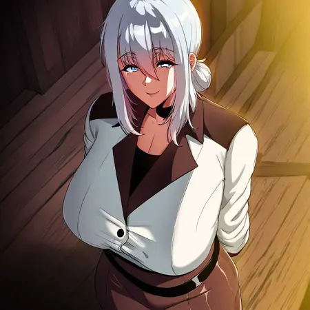 (( lora:rootbeer\_brandy:1 , rootbeer_brandy, thin waist, wide hips, beautiful skin, piercing light blue eyes, clear eyes, bright pupils, beautiful eyes, beautiful silver hair, hair bun, bangs, hair between eyes, huge and shaggy breasts, natural beauty, extraordinary beautiful woman, attractive woman, super sexy woman, lustful body, sexy woman with seductive obscene body, sensual body, voluptuous body, sexy beauty, no piercings, no piercing, ))