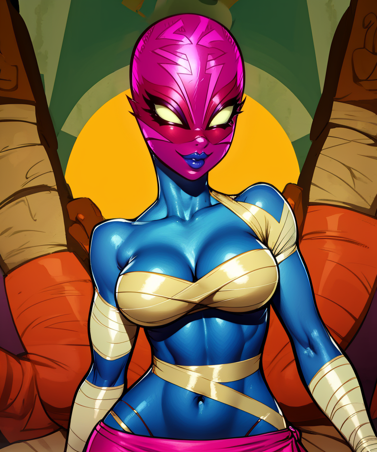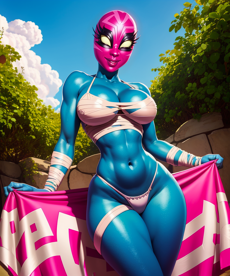 トスタダ、青肌、薄いピンクのマスク、またはマスク、濃いピンクの唇。