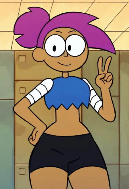 3nid, dark-skinned female, purple hair, crop top, bike shorts, brown boots