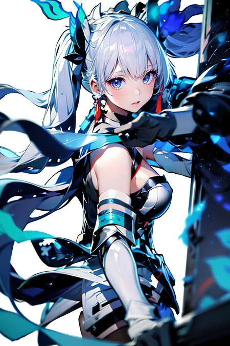 프롬프트: Airi_AoV_HS, 1girl, solo, white hair, bangs, long hair, very long hair, twin tail, headband, black headband, cyber headband, horns, eyelashes, long eyelashes, eyeliner, sharp eyelids, blue eyes, makeup, lips, earrings, red earrings, head, face, smile, close mouth, bodysuit, white/black bodysuit, leotard, cybernetic leotard, bare shoulders, shoulder armor, white/black shoulder armor, transparent shoulder armor, arm armor, gloves, gray gloves, thighs, white thighs, stockings, cyber tights, boots, long boots, platform shoes, standing, full body, white blackground