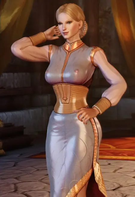AnoraTheirin,1girl,solo,blonde hair,blue eyes,braid,dress,jewelry,large breast,lips,hair bun,earrings,belt,long dress,boots,long sleeves,cuff,collar,closed dress,