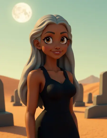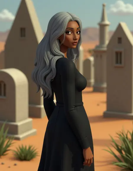 1명의 여성, 노인 여성, 아름다운 여성, ((검은 피부)), 긴 회색 머리, 갈색 눈, 검은 드레스