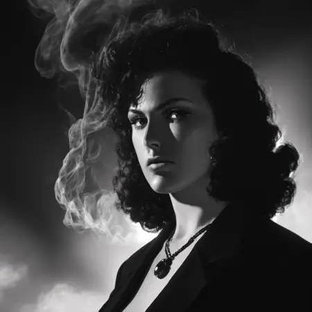 좋은 키워드: ** femme fatale**, detective, dimly lit, trench coat, silhouette, 35 mm