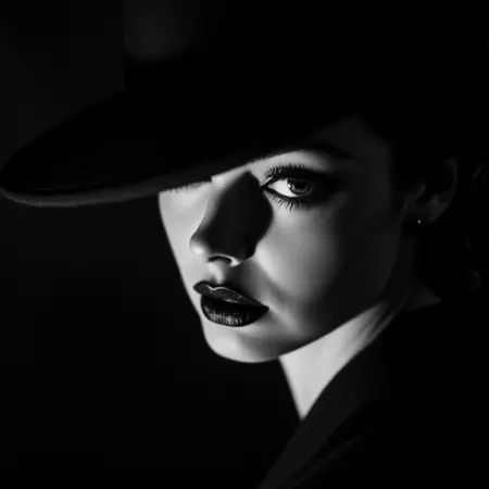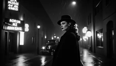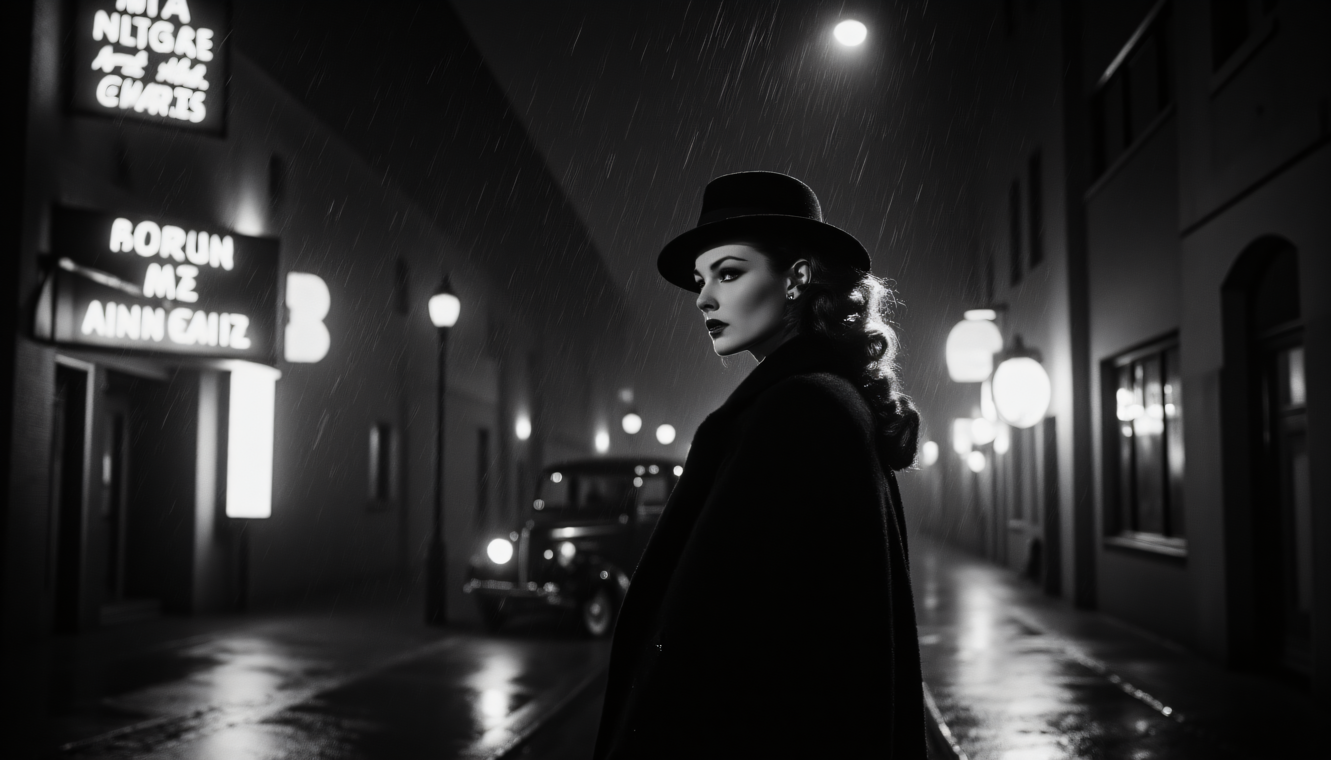 Good keywords femme fatale, detective, dimly lit , trench coat, silhouette, 35 mm
