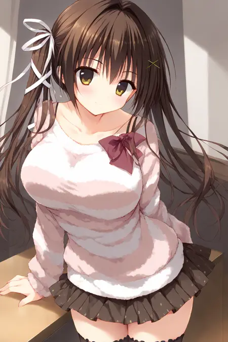 casual, sweater, striped, striped sweater, long sleeves, bow, red bow, off shoulder, off-shoulder sweater, bare shoulders, bra strap, skirt, polka dot, polka dot skirt, brown skirt, frilled skirt, miniskirt, layered skirt, thighhighs, brown thighhighs, black thighhighs, argyle, argyle legwear, zettai ryouiki, legs,