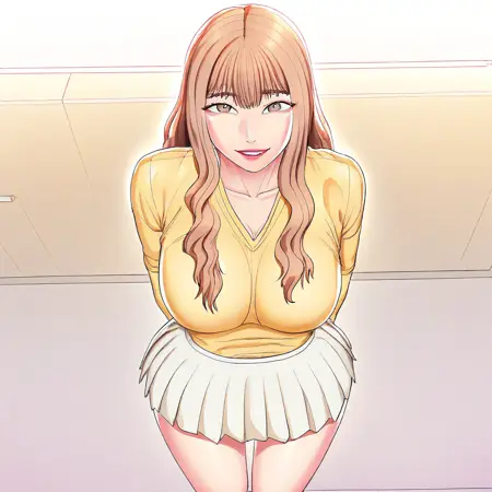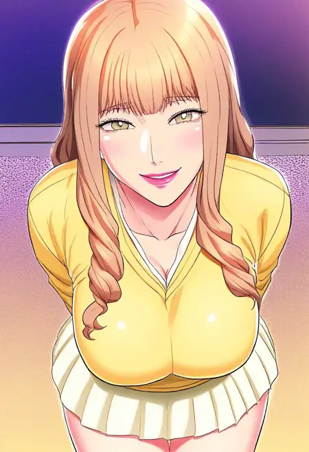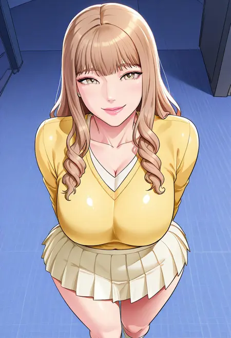 ((セクシーなロングスリーブのイエローパルオーバー、セクシーなイエローのプリーツスカート、白い靴下、白いスニーカー)) + 白いパンツ、白いブラ、+ 茶色のロングストラップハンドバッグ