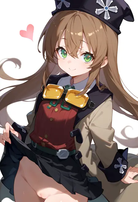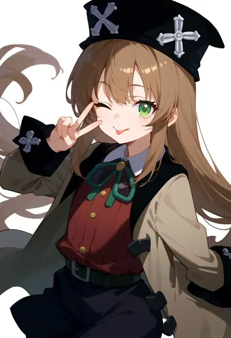 트리거 단어: el mofus, 긴 머리, 초록색 눈, 갈색 머리, 검정색 머리 장식, 빨간 셔츠, 검정 접이식 치마, 벨트, 목에 둘러진 안경, 갈색 코트,