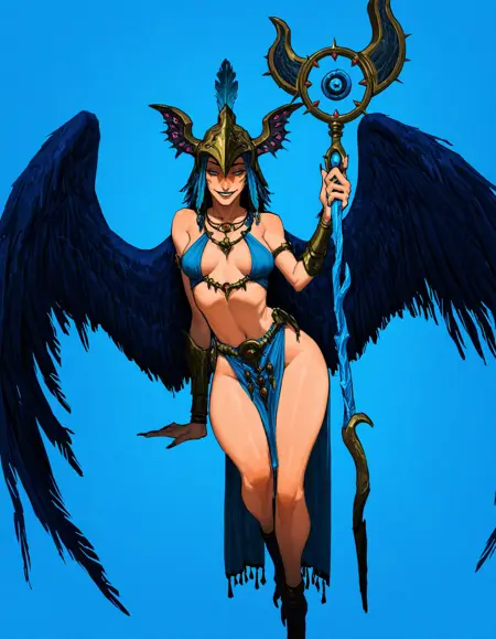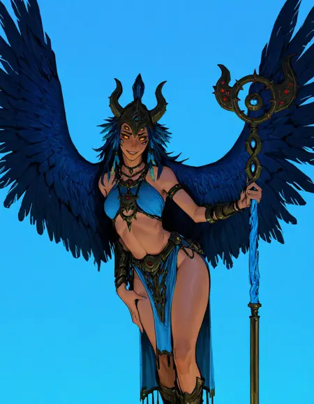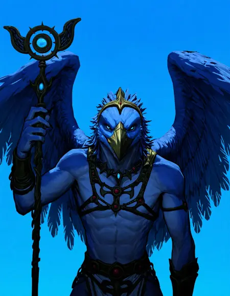 ExaltedLordofChange, monster, no humans, blue eyes, holding staff, wings, beak,