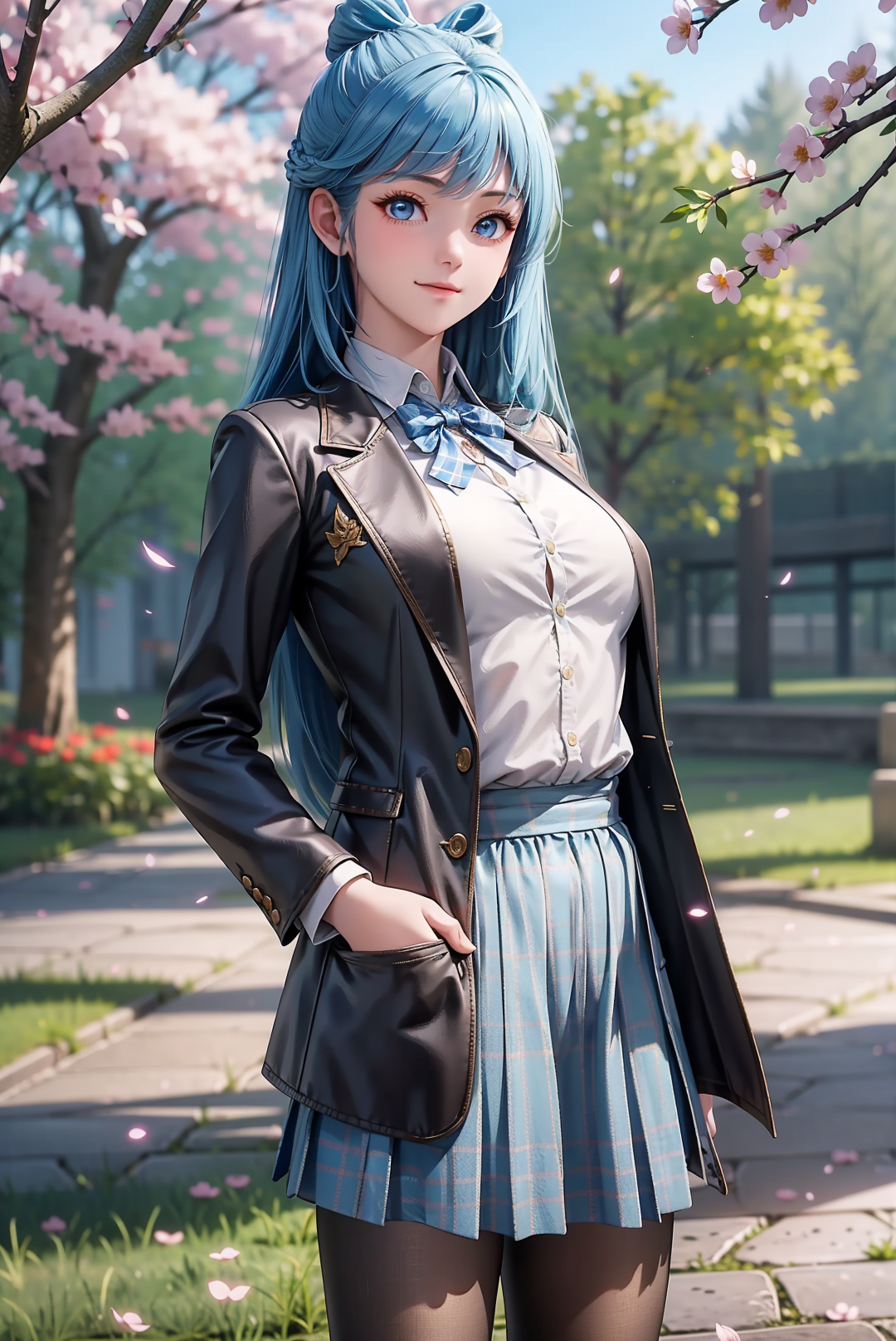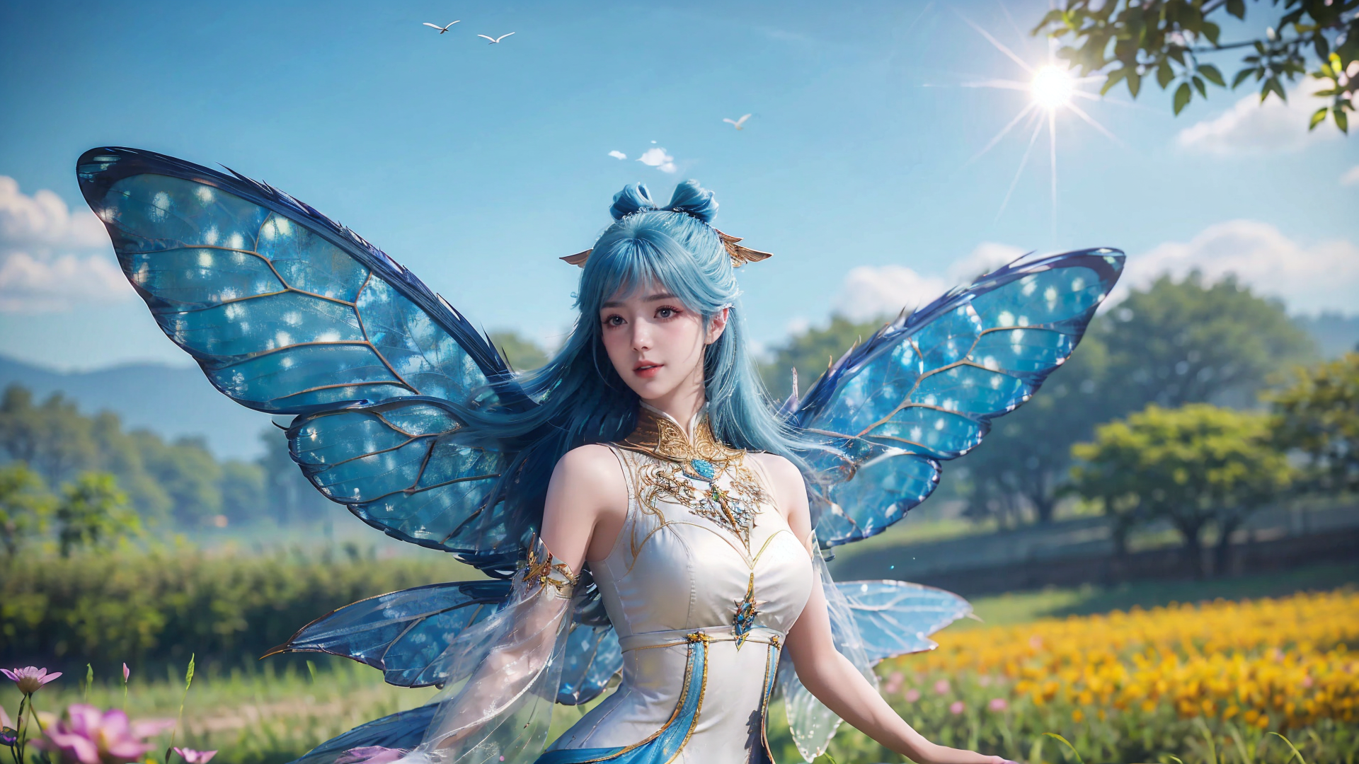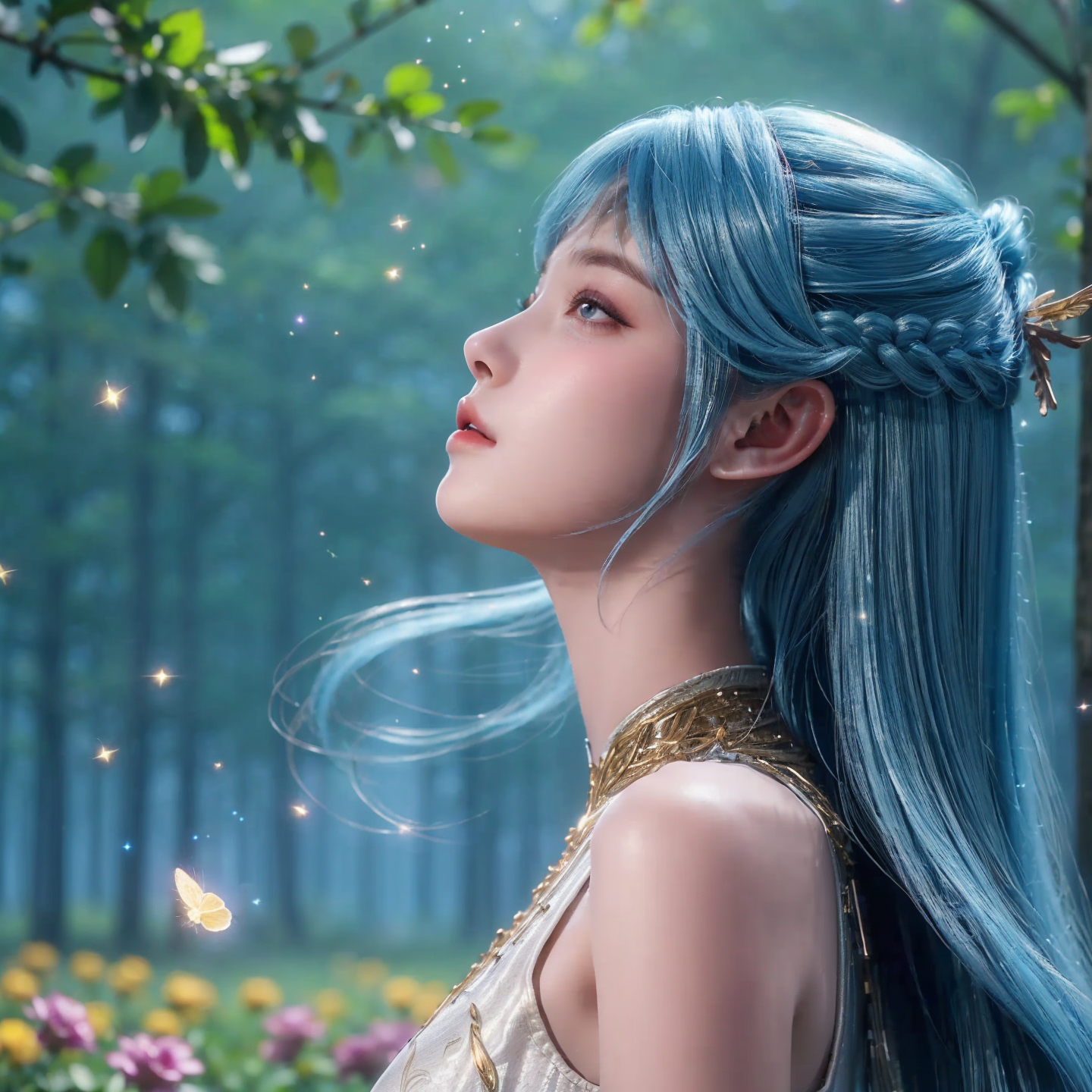 提示词参考: 1girl,solo, long hair,blue hair,blue eyes , hair ornament,dress