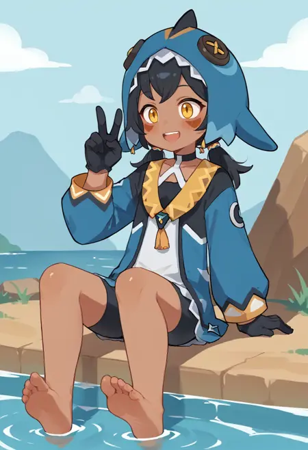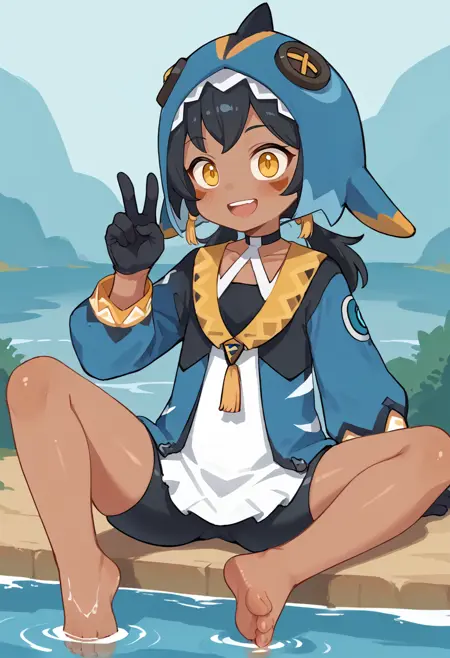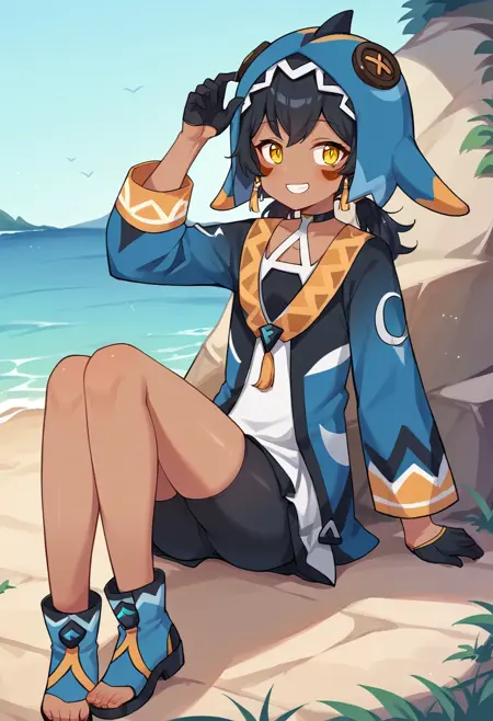dark-skinned female, black hair, low pigtails, yellow eyes, blue animal hat, shark hat, choker, facial mark