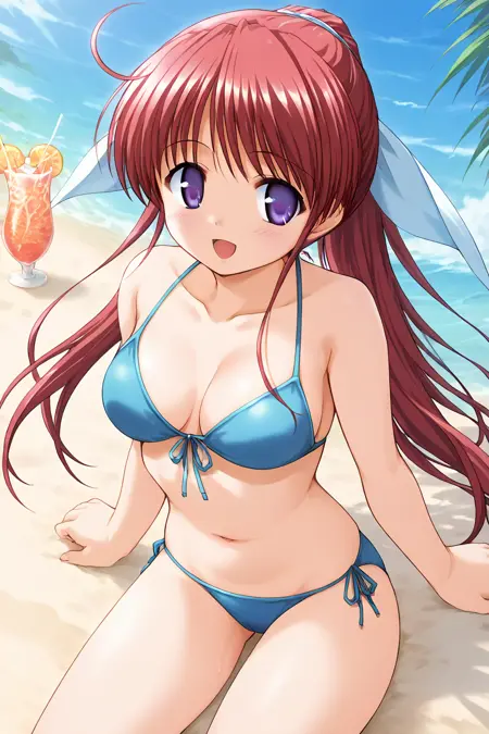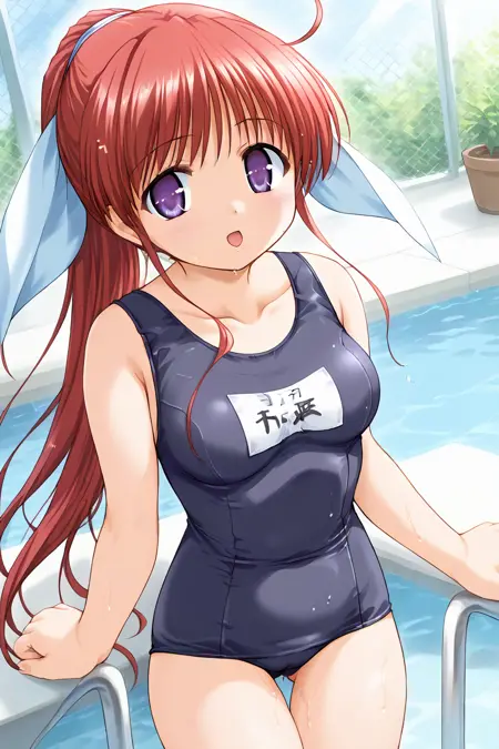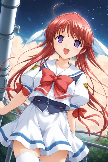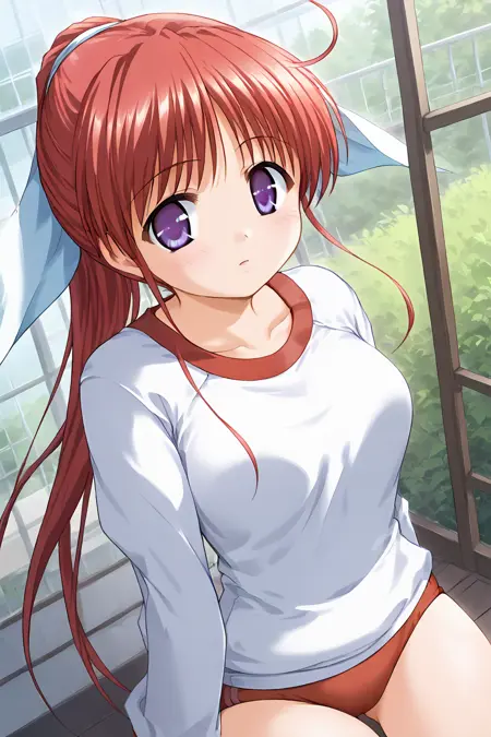amagasaki mikoto,purple eyes,blue eyes,red hair,long hair,ponytail,hair ribbon,white ribbon,