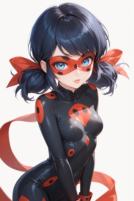 - mask, red bodysuit, bodysuit, polka dot, domino mask, superhero, hair ribbon, ribbon, earrings