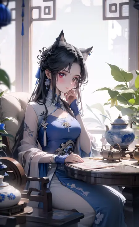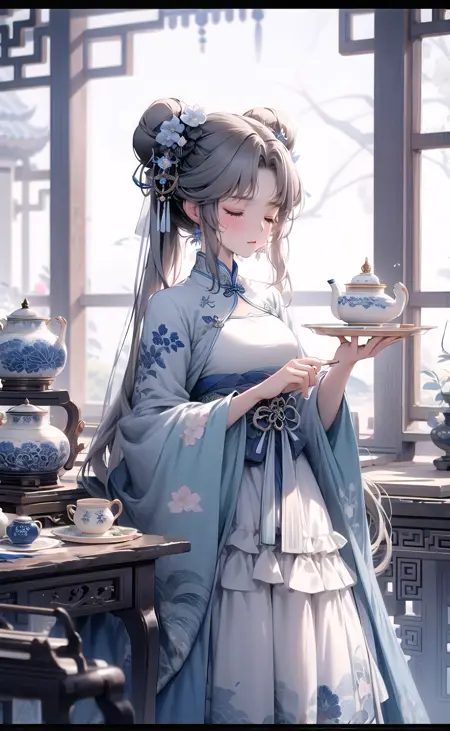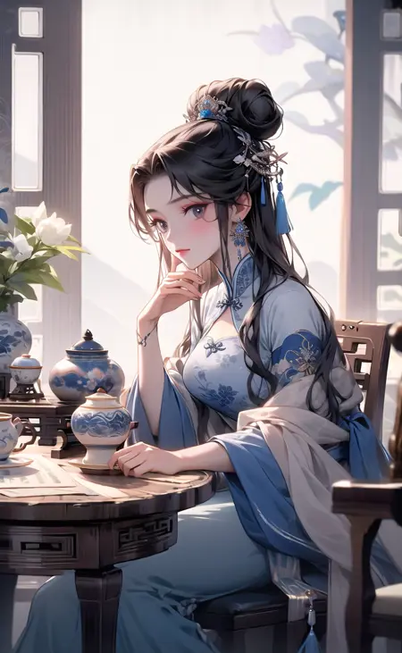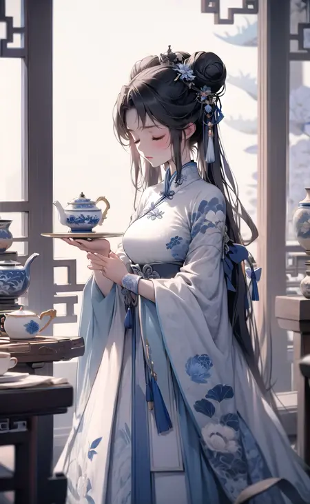 이 모델은 세련된 청화 스타일의 옷, 장식물, 그리고 새로운 한풍 배경을 생성할 수 있습니다.
