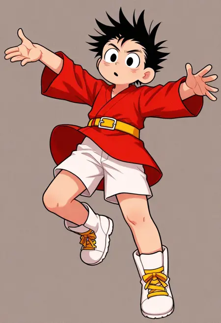 TikaraTDM, 1boy, black spiky hair, fair skin, squinted eyes, black eyes, short, red robe with white accents, yellow belt, white shorts, white boots,