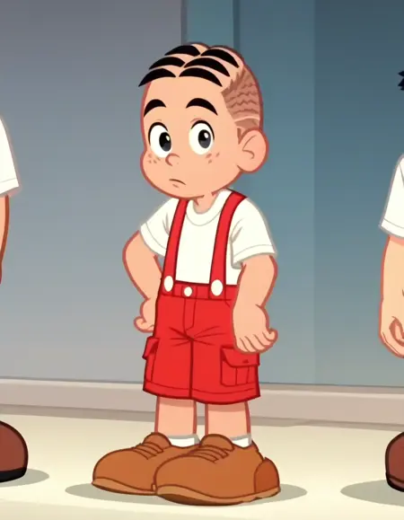 ManezinhoTDM, shirt, black hair, 1boy, black eyes, white shirt, shoes, pants, red suspenders, brown footwear, red shorts