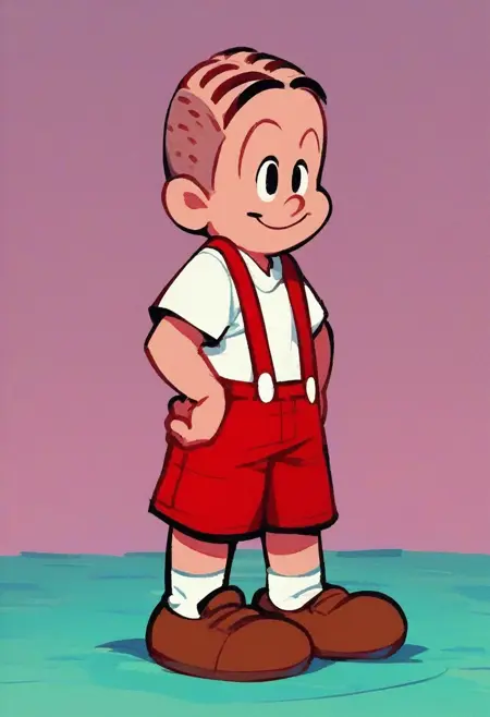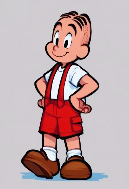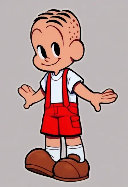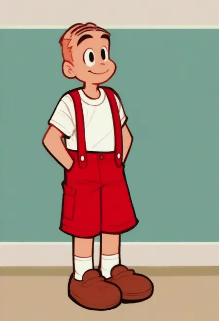 manezinho, short hair, shirt, 1boy, white shirt, short sleeves, shorts, shoes, socks, black eyes, brown footwear, white socks, red suspenders, red shorts, suspender pants