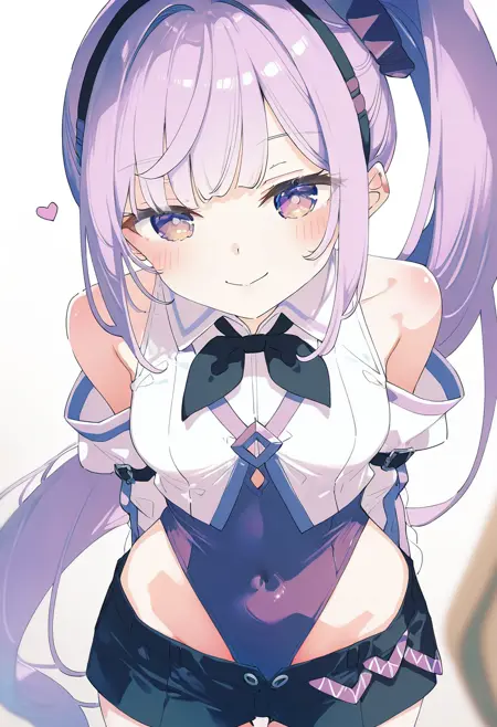 ai_chan(arc), purple_hair, side_ponytail, short_shorts, detached sleeves, bare_shoulders, long_hair, gloves, thighhighs, purple_eyes, covered navel, black bow, medium breasts,