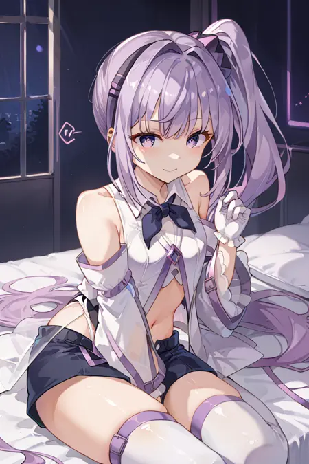 ai_chan(arc),purple_hair,side_ponytail,short_shorts,detached sleeves,bare_shoulders,long_hair,gloves,thighhighs,purple_eyes,covered navel,black bow,medium breasts,