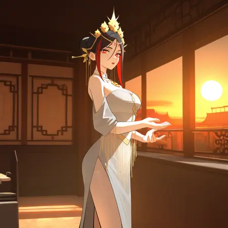 Mulan, Jin_Def, 红眼, 红唇, 黑发, 杂色发, 红发, 长发, 中国风服饰, 肩部护甲, 发饰, 长裙, 白色长裙, 蓬松短袖, 蕾丝袖, 白色袖子, 红色胸带, 腰带, 灰色腕甲, 红色丝带, 黑色连裤袜, 连裤袜,