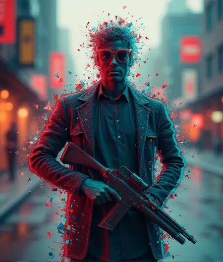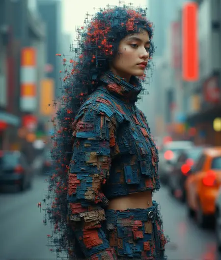 자연어로 설명하면 세부 사항이 풍부해지지만, 단순한 트리거 단어만으로는 효과를 충분히 표현하기 어려우므로 "digital dissolve, flowing pieces, abstract"와 같은 태그를 사용하여 완성하는 것을 추천합니다.
