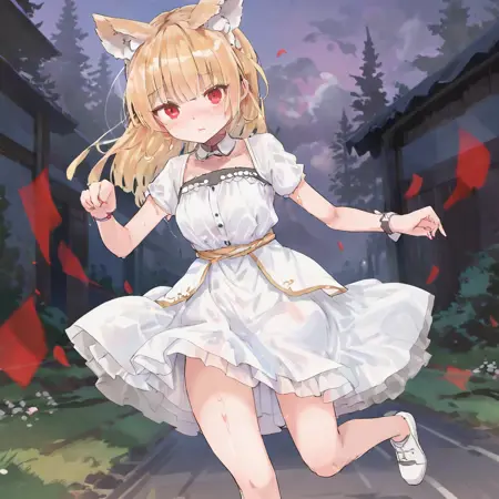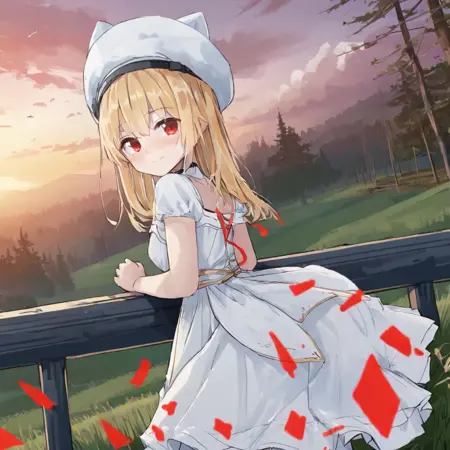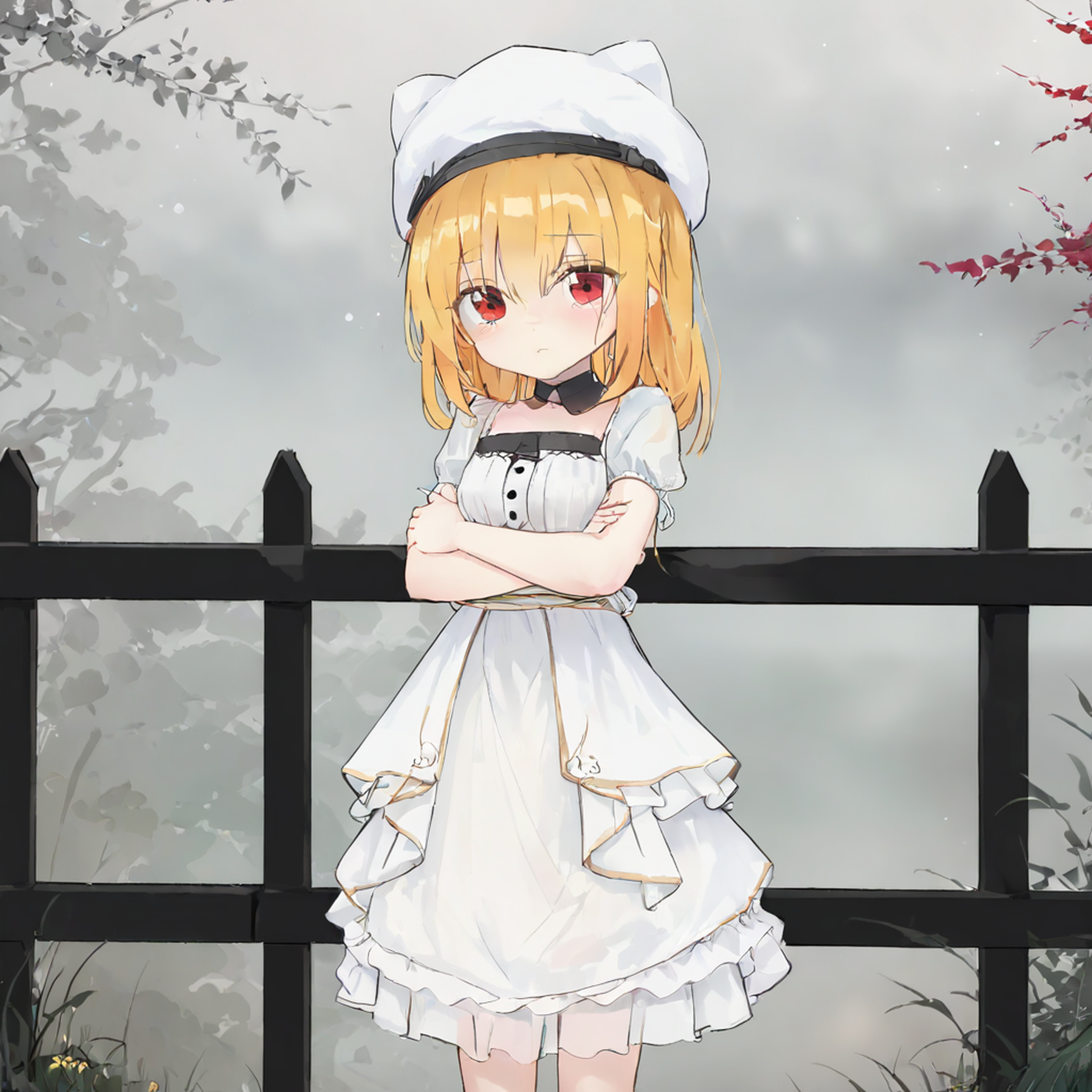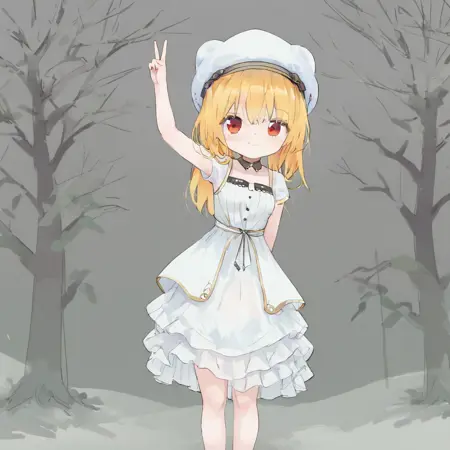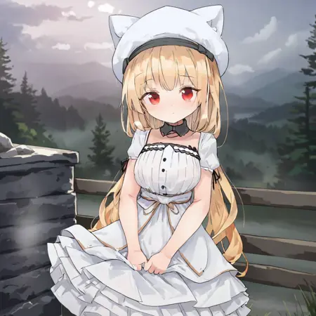 より良いパフォーマンスを引き出すための使用語:white hat, yellow/blonde hair, white dress, red eyes, ears