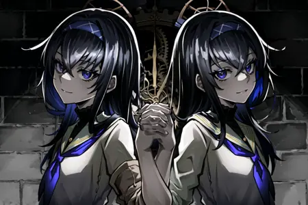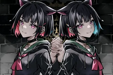 추천 프롬프트: requiem, 시청자에게 시선을 붙잡고, 미소, 여러 소녀, 2명의 소녀, 상체, 손을 잡고, 벽돌 벽